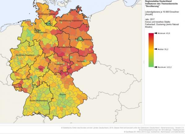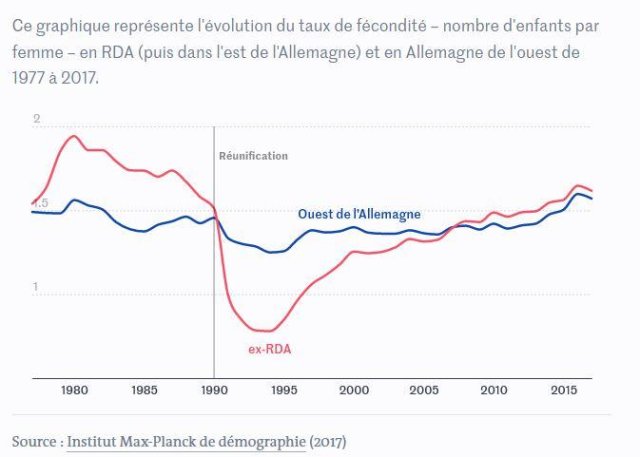 En 2017, le taux de natalité est cependant quasiment moitié moins élevés en ex RDA qu’en ex RFA. Résultat de l’émigration massive des jeunes, et de l’effondrement du taux de natalité de la décennie noire de la réunification.