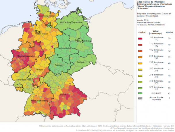 Héritage de la RDA socialiste, à l’Est, la proportion d’enfants de moins de deux ans gardés en crèche est 3 fois plus élevée en RDA, en 2018.