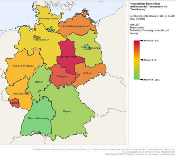 On a longtemps fait croire que la migration Est-Ouest était un mouvement de fuite du socialisme. 30 ans après la chute du mur, force est pourtant de constater que l’Est de l’Allemagne continue de se dépeupler, à l’exception de la région capitale, au profit du sud de l’Allemagne. En témoigne la carte suivante montrant l’évolution de la population pour 1000 habitants dans chacun des Länders allemands en 2017.