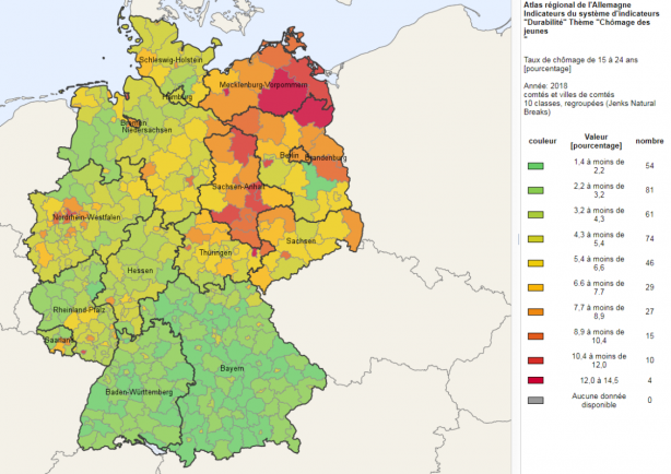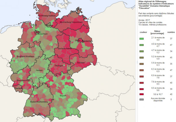 En 2017, des années après la chute du mur dans la majorité des régions de l’ex RDA le taux de jeunes sortants sans diplômes du système scolaire était jusqu’à deux fois supérieur, à celui de l’ouest de l’Allemagne :
