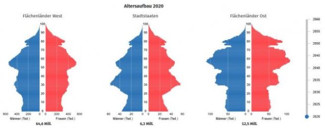 Les bilans et projections de la statistiques allemande montrent le résultat catastrophique, 30 ans après, de la chute du mur pour l’Allemagne de l’Ouest. Alors que la RDA avait une démographie plus active que la RFA, la chute du mur provoque un effondrement de la démographie, dont les Länders de RDA ne se sont pas remis.