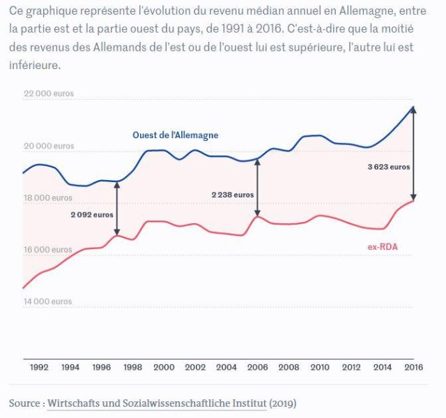 En 1991, l’écart de revenu annuel moyen entre l’Est et l’Ouest était de 4432 €, en 2016, il était de 3623€. Démontrant que la chute du mur n’a pas conduit à réduire l’écart de revenu entre allemands de l’Est et de l’Ouest. Et ce alors que l’Allemagne de l’Est n’a plus depuis des décennies une économie socialiste.