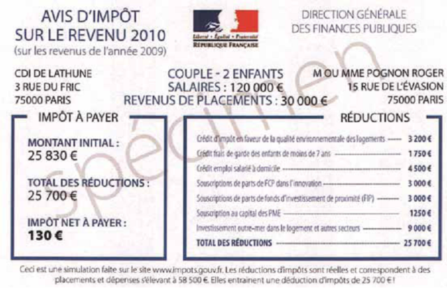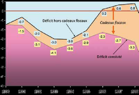 Si l’État emprunte de l’argent, c’est pour pouvoir combler ses déficits budgétaires, c’est-à-dire la différence entre ses dépenses et ses recettes fiscales. Ce déficit s’est élevé à 56 milliards d’euros en 2008 et à 100 milliards en 2009. Ce déficit ne provient pas d’un excès de dépenses publiques mais de la politique de baisse des impôts. Ce phénomène a été reconnu par Gilles Carrez, rapporteur UMP de la commission des Finances de l’Assemblée nationale : « L’accumulation de baisses d’impôts depuis 2000 semble avoir conduit à un accroissement du déficit structurel car, si le taux de prélèvements obligatoires apparaît en baisse tendancielle sur la décennie, le taux de dépenses publiques, en revanche, reste stable. » En clair : les dépenses sont constantes, les recettes diminuent. S’il n’y avait pas eu toutes les baisses d’impôt effectuées depuis dix ans, les recettes de l’État auraient dû se monter en 2008 à 348 milliards d’euros, à comparer aux 265 milliards collectés en réalité. Il manque donc chaque année au moins 83 milliards d’euros dans les caisses de l’État ! Cela concerne surtout l’impôt sur le revenu, payé par les plus riches, ainsi que l’impôt sur les sociétés : crédit d’impôt recherche, taxation réduite des plus-values, taxe professionnelle. Il faut y ajouter les droits de succession, le bouclier fiscal, la baisse de la TVA pour les restaurateurs. Qui ne paie pas ses impôts s’enrichit. Chaque année, le déficit se reproduisant au rythme des nouvelles baisses d’impôts, on entretient ainsi le mythe d’un État trop dépensier. D’autant qu’il existe en France une certaine aversion populaire à l’égard de l’impôt. La classe dirigeante s’appuie habilement sur elle pour véhiculer sa propre haine envers l’impôt, voie royale vers les privatisations et le démantèlement du service public.