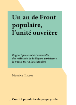 Un an de Front Populaire, L’unité ouvrière Discours de Maurice Thorez à l’assemblée des militants de la Région parisienne Le 9 Juin 1937 à la Mutualité
