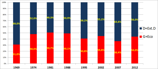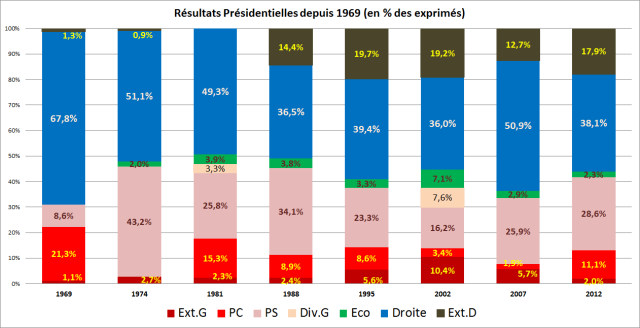 Enfin, on peut noter que le total extrême-gauche + parti communiste ou Front de Gauche reste en 2012 à un niveau bas, supérieur certes à 2007, mais en dessous de 1995 ou 2002, sans parler de 1981.