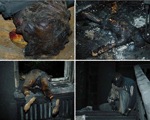 Ce qui est arrivé ensuite, "je n’ai toujours pas réalisé" dit-il, et sa voix tremble. Selon Youri, ils ont immédiatement fait usage contre lui de matraques et d’armes à feu. « Le gars qui était à mes côté est tombé immédiatement. Ils nous ont poussés dans le bâtiment et coupé toutes les voies de retraite. Je me suis retrouvé dans l’aile droite du 3e étage, nous étions une douzaine de personnes dans une pièce. Les Pravoseki ("Secteur droit") ont commencé à bombarder le bâtiment avec des cocktails Molotov et à tirer sur les fenêtres. Le premier étage était en flammes, puis au-dessus de nous, la fumée s’est propagée dans les couloirs, il était impossible de sortir… Nous avons ouvert les fenêtres et cassé les vitres, mais il n’y avait pas de salut : les fumées de la Place entraient dans la chambre. Des gens sautaient par les fenêtres à l’étage au-dessous, on les achevait en bas. D’en bas, ils criaient "gloire à l’Ukraine" et "mort aux ennemis"… C’était l’enfer ! Les Pompiers sont arrivés, ils ont commencé à éteindre l’incendie au rez-de-chaussée » dit le témoin oculaire.