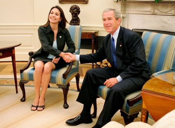 À l’extrême-droite de l’échiquier politique, elle a longtemps occupé une position marginale. En 2010, elle est élue députée. En 2012, elle se présente aux primaires de la droite mais n’obtient que 3% des voix. Sa « base » sont des ONGs comme « Sumate » ou « Vente Venezuela », financées par les États-Unis. Son admiration pour le Likoud est la sublimation de ce qu’elle ferait au pouvoir, après avoir appuyé en vain les coups d’État contre Chávez puis contre Maduro. Elle a signé un accord « stratégique » de coopération avec ce parti pour, en cas de victoire, compter sur le savoir-faire contre-insurrectionnel dont les israéliens sont spécialistes (voir les massacres commis par leurs « élèves » en Colombie, au Guatemala, etc…). Cette répression de la rébellion populaire a déjà eu lieu pendant les 48 heures du coup d’État contre Chávez en 2002 (15). Maria Corina était des signataires du décret putschiste qui supprima toutes les autorités démocratiques du pays et intronisa le chef du patronat Pedro Carmona comme président. En 2005, elle a rencontré l’ancien président américain George W. Bush à la Maison-Blanche pour discuter du « retour à la démocratie », c’est-à-dire du renversement du gouvernement bolivarien.