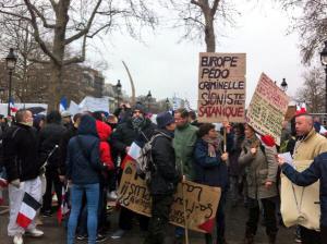 En ce qui concerne la manif "jours de colère", les questions de mœurs, par lesquelles le PS prétend faire l’unique différence avec la droite, ont fourni le socle du rassemblement des conservateurs, avec sa peur fascination face aux sodomites. Mais sur cette peur et la revendication encouragée par l’Église catholique contre le mariage gay et l’avortement, peu à peu viennent se greffer les gros bataillons du mécontentement économique et social. La petite bourgeoisie contre la fiscalité et contre les "cadeaux" aux pauvres et aux étrangers avance bras dessus bras dessous avec les jeunes décérébrés des cités et les identitaires anti-islamistes. Ce mouvement joue avec la violence alors même que le bipartisme européen consacre l’impossible solution en dehors du vote utile. Ce n’est pas l’antisémitisme qui a rassemblé le gros des troupes mais bien l’homophobie et la remise en cause de la famille traditionnelle ou considérée comme telle. Avec le catholicisme traditionnel, la mise en ligne de mire du peuple déicide n’est jamais très loin et la jonction avec les troupes identitaires et de Soral est aisée, ce qui a pour vocation le recrutement des "jaloux" des victimes de la Shoah, africains et maghrébins sous une forme désorganisée ou bourgeoisement guidée par Tariq Ramadam, même si, comme le FN, il prend ses distances… Le caractère hétéroclite et l’inconsistance des revendications fait partie du jeu et commande la violence.