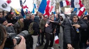 Attention danger : 250 interpellations après des violences contre la police, 19 policiers blessés. Ils étaient 17.000 selon la police, 120.000 selon les organisateurs à s’être rassemblés sous la pluie pour demander la démission de François Hollande. Et là, c’est clairement les années 30. Le collectif « Jour de colère », rassemblement hétéroclite formé d’intégristes catholiques, d’opposants au mariage homosexuel, de partisans de Dieudonné, d’identitaires et de familles, d’opposants à l’écotaxe, a défilé (le 26 janvier 2014, ndlr) contre « l’action gouvernementale » et pour demander la destitution du président de la République. Dans les manifestants, on a tout : des partisans de Dieudonné, des militants d’extrême droite, des gens écœurés de la liaison Hollande-Gayet, des opposants à la fiscalité trop lourde. Entre autres slogans "Juif, la France n’est pas à toi", "CRS, milice des Juifs".