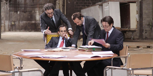 Adaptant la pièce de Frédéric Lordon, c’est en alexandrins que Gérard Mordillat choisit de parler de la crise. Dans un décor post-apocalyptique (une usine désaffectée d’Aubervilliers), les banquiers en costume débattent et déambulent sans grande avancée, sans idée forte. La crise paralyse. Seul le petit président, dont on peine à savoir s’il est naïf, cynique ou simplement crétin, demeure insensible à son souffle.