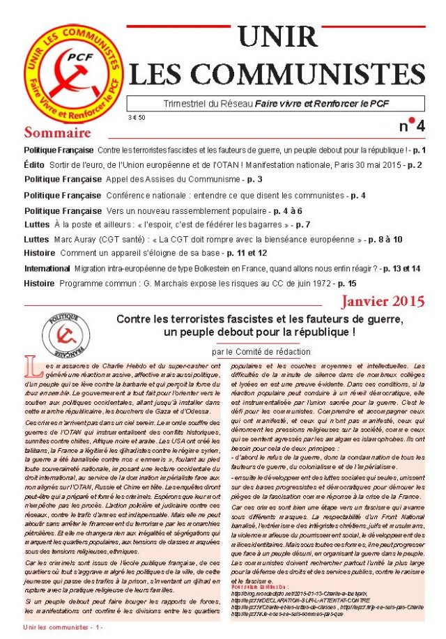 Si un peuple debout peut faire bouger les rapports de forces, les manifestations ont confirmé les divisions entre les quartiers populaires et les couches moyennes et intellectuelles. Les difficultés de la minute de silence dans de nombreux collèges et lycées en est une preuve évidente. Dans ces conditions, si la réaction populaire peut conduire à un réveil démocratique, elle est instrumentalisée par l’union sacrée pour la guerre. C’est le défi pour les communistes. Comprendre et accompagner ceux qui ont manifesté, et ceux qui n’ont pas manifesté, ceux qui dénoncent les pressions religieuses sur la société, comme ceux qui se sentent agressés par les amalgames islamophobes. Ils ont besoin pour cela de deux principes :