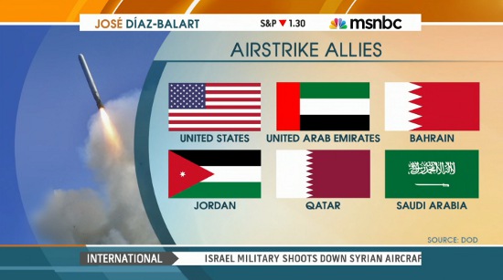 Les drapeaux de la photo ci-dessus laissent peu de doute sur les alliés de l’Occident dans la dernière opération militaire : l’Arabie saoudite, le Bahreïn, les Émirats, le Qatar et la Jordanie. Les quatre premiers pays sont des monarchies du Golfe qui imposent un régime théocratique dans lequel les libertés n’ont pas leur place. Le Qatar est la source de la plus importante d’aide probablement reçu par les groupes insurgés syriens, et les aides ont été versées à l’État islamique et à Nusra, le même groupe qui soutient Khorasan.