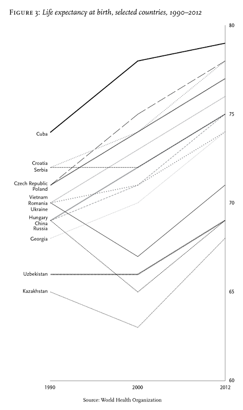 Il ne fait aucun doute que les Cubains ont souffert de graves difficultés depuis 1990, mais en termes de résultats sociaux, d’autres pays de l’ex-Comecon ont vu pire. Comme le montre la figure 2, le taux de mortalité infantile à Cuba en 1990 était de 11 pour mille, déjà beaucoup mieux que la norme Comecon ; en 2000, il était tombé à seulement 6 pour mille, une amélioration plus rapide que la plupart des pays d’Europe centrale qui ont été pris sous l’aile de l’UE. Aujourd’hui, il est de 5 pour mille – mieux que les États-Unis, selon les estimations de l’ONU, et bien au-dessus de la moyenne latino-américaine. Les données sur l’espérance de vie, voir figure 3, brossent un tableau semblable : à Cuba, l’espérance de vie a augmenté de 74 à 78 ans au cours des années 1990, malgré une légère hausse des taux de mortalité pour les groupes vulnérables au cours des années les plus difficiles [4]. Dans les autres pays de l’ex-Comecon, l’augmentation de la pauvreté a contribué à une baisse moyenne de 69 à 68 ans au cours des années 1990. Aujourd’hui, Cuba a l’une des espérances de vie les plus élevées de l’ex-bloc soviétique et parmi les plus élevées en Amérique latine.