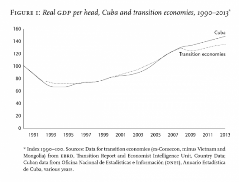 Le problème avec cette version est que la réalité a manifestement refusé de se plier aux prédictions. Bien que Cuba faisait face à des conditions exceptionnellement difficiles – en subissant le pire choc exogène de tous les pays membres du bloc soviétique et, grâce à l’embargo commercial américain de longue date, confrontée à un environnement international unique en son genre – son économie a eu des performances similaires aux autres pays de l’ex-Comecon, se classant 13e sur 27 pour lesquelles la Banque Mondiale dispose de données complètes. Comme montre la figure 1, sa courbe de croissance a suivi la tendance générale des "économies en transition" : une profonde récession au début des années 1990, suivie d’une reprise qui a mis une dizaine d’années pour retrouver le niveau de revenu national réel par habitant de 1990, avec une augmentation d’environ 40 pour cent jusqu’en 2013 [3].