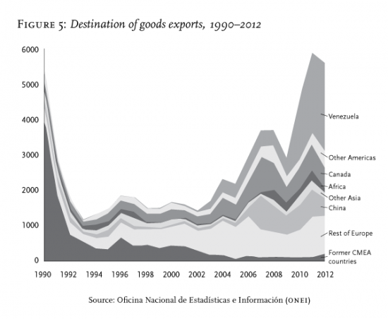 La figure 5, qui montre la destination géographique des exportations, révèle l’étendue de la réorientation du commerce de biens. En 1990, quelque 75% des exportations étaient vendues à d’anciens pays du Comecon, mais en 2012 elles représentaient moins de 5%. Autour de 2000, Cuba a réussi à atteindre un degré de diversification sans précédent de ses partenaires à l’exportation, avec l’Europe de l’Ouest représentant 32% du total, les anciens pays du Comecon 27%, le Canada 17%, l’Asie 12%, et le reste des Amériques – hors États-Unis, qui reste fermé aux exportations cubaines – à 10%. Depuis, la dépendance envers un partenaire unique a de nouveau augmenté : en 2012, le Venezuela représentait non seulement 45% des exportations de biens – en grande partie des produits pétroliers de la raffinerie de Cienfuegos – mais aussi la plupart des services non-touristiques de Cuba.