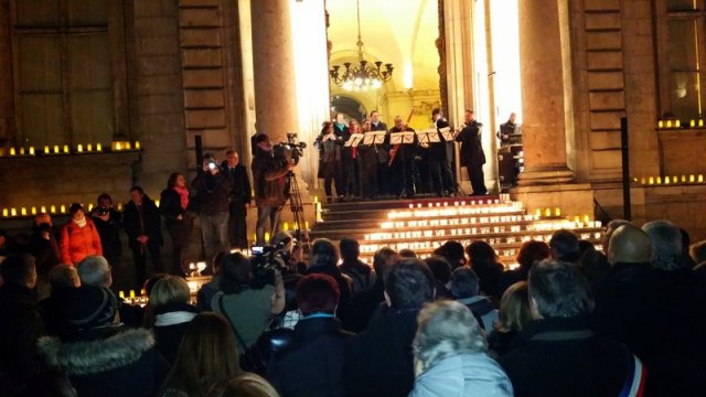 Les milliers de personnes rassemblées en quelques heures sur la place des Terreaux hier soir, (15.000 dit le Progrès ; mais qui a compté tous ceux qui cherchait à rejoindre la place dans tout le centre ville ?), sont la première réponse, entre recueillement, cris pour Charlie et Marseillaise.