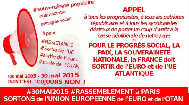 En nous appuyant sur les luttes en cours et celles en devenir, nous proposons aux militants et aux organisations communistes, aux syndicats, aux progressistes et patriotes antiracistes et antifascistes, à tous ceux qui s’opposent à cette guerre de classe européenne, qui ont milité pour la victoire du NON au TCE, de faire de ce mois de mai un moment de mobilisation pour la sortie du carcan de l’UE, de l’euro et de l’OTAN jusqu’à un rassemblement national le 30 mai 2015 à Paris.