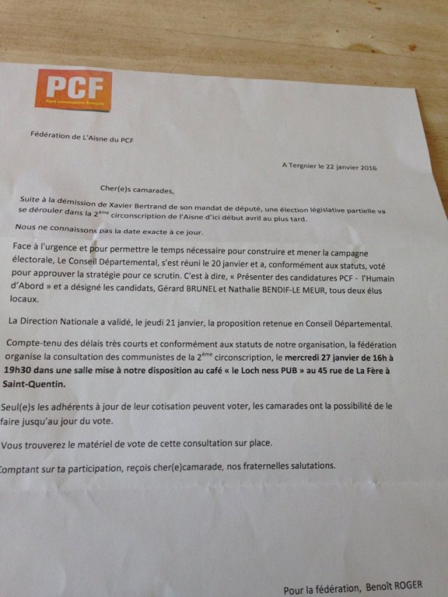 Lundi 25 janvier 2016, une partie des adhérents de la Section de Saint Quentin reçoit une lettre de convocation pour une consultation des communistes organisés 2 jours plus tard, le mercredi 27 janvier dans un bar excentré de Saint Quentin (lieu de l’annonce des dernières candidatures de division du Front de Gauche face aux candidats communistes lors des dernières départementales, voir l’article). Sur ce courrier, n’est annoncée qu’une seule candidature, celle de la fédération de l’Aisne : Gérard Brunel comme titulaire et Nathalie Bendif comme suppléante. Aucune mention n’est faite de notre candidature, aucun bulletin de vote n’est présent dans l’enveloppe, aucun moyen n’est donné aux camarades absents ou dans l’incapacité de se déplacer pour voter par correspondance.