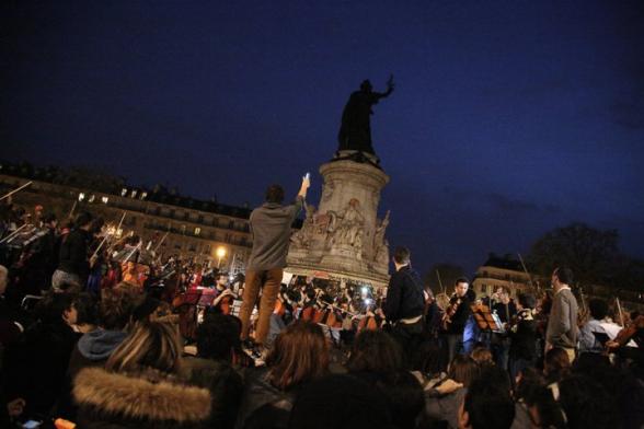 Sur la place de la République, la nuit est tombée depuis longtemps, la foule est nombreuse. Un orchestre symphonique achève dans l’enthousiasme de jouer la Symphonie du Nouveau Monde.