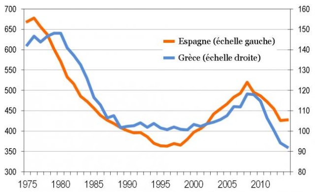 La crise a d’abord un impact sur la démographie : à partir de 2009, la population totale diminue dans les pays les plus frappés par la crise, notamment l’Espagne, le Portugal et la Grèce. Ce phénomène s’explique par l’inversion des soldes migratoires : les entrées d’immigrés se tarissent, et l’émigration se développe. Mais la crise laisse aussi sa marque sur un autre indicateur dont on pourrait penser qu’il était relativement indépendant, à savoir le nombre de naissances. Il est frappant de constater qu’il a suivi la même évolution en Espagne et en Grèce : baisse jusqu’au milieu des années 1980, stabilisation, puis augmentation depuis le début du siècle (voir graphique 1). Et, dans les deux pays, l’irruption de la crise provoque un nouveau retournement à la baisse.