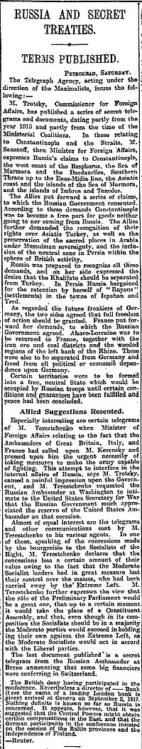 Lénine fait donc publier ces traités le 13 novembre 1917 dans la Pravda. Ils seront repris dans le Manchester Guardian et dans The New Europe.