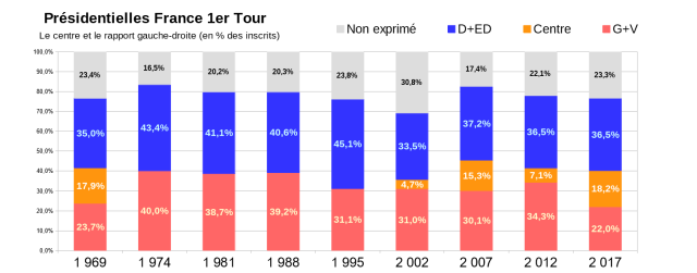 Le rôle du centre dans le glissement à droite est clair. Ce n’est pas un dépassement du clivage gauche-droite mais bien un affaiblissement de la gauche.... qui se retrouve avec 28,7% des exprimés en dessous du niveau de 1969 (31%)... en dessous aussi en mobilisation des électeurs potentiels (en pourcentage des inscrits..)