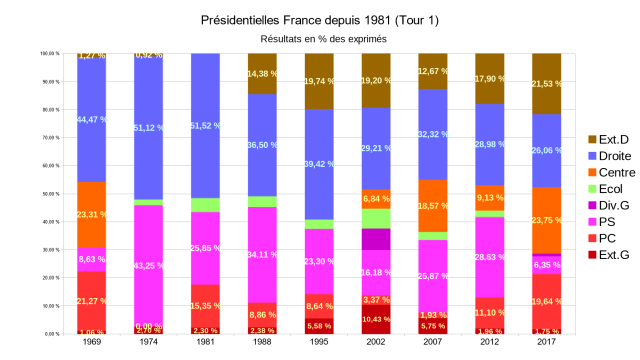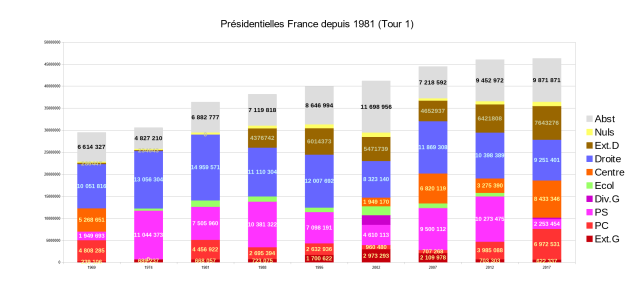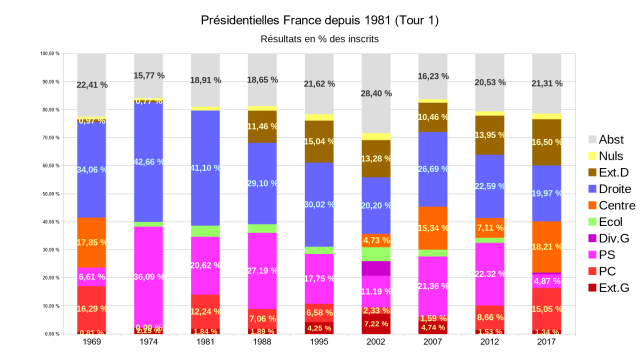 L’historique des résultats des présidentielles en voix, en% des inscrits et des exprimés...
