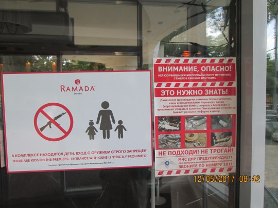 Toujours en guerre : panonceaux « pas d’armes à feu » et « prenez garde aux munitions non explosées » aux portes d’un magasin de Donetsk