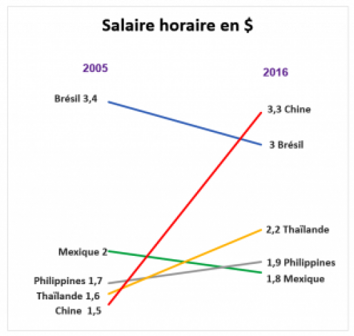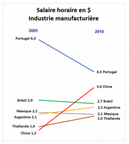 Il y a quinze ans des multinationales occidentales sont allées massivement en Chine en raison des faibles salaires. A présent le mouvement inverse est en train de s’amorcer. Les salaires moyens dans l’industrie chinoise ne sont plus inférieurs que de 20% à ceux du Portugal. En Bulgarie, Macédoine, Roumanie, Moldavie et Ukraine, dès 2013 les salaires minimum étaient déjà plus bas qu’en Chine (23).