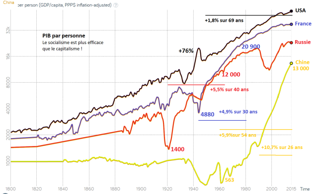 Pour voir l’évolution des pays sur 2 siècles... Aller sur gapminder, sélectionner les pays qui vous intéressent à droite, et cliquer sur le bouton « play » en bas à gauche... vous verrez l’évolution générale, l’impact des guerres, et les succès du socialisme !