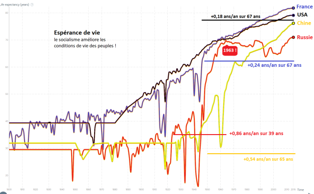 Certains me diront que l’argent ne fait pas le bonheur et que si le socialisme a connu des périodes de succès économiques, c’est sans doute au détriment de la vie de ses citoyens. Alors regardons l’indicateur le plus représentatif des conditions de vie, l’espérance de vie. On sait que c’est la baisse de cet indicateur dans l’URSS des années 70 qui avait conduit Emmanuel Todd à pronostiquer la chute du socialisme soviétique.