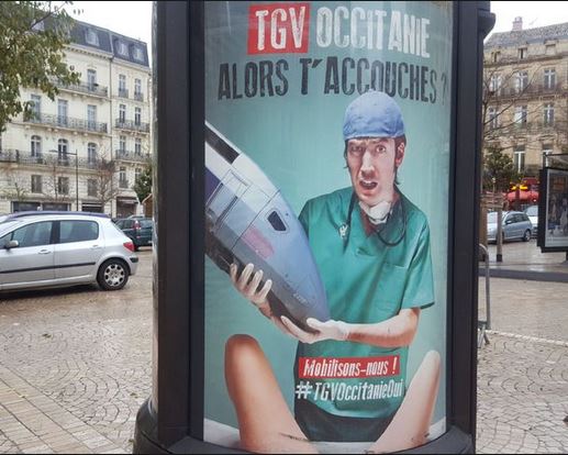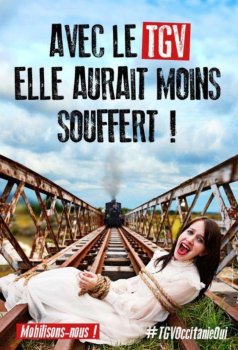 Pour appeler à la mobilisation en soutien du projet LGV en Occitanie, Robert Ménard présente une affiche, entre autres, qui met en scène une jeune femme ligotée sur les rails alors que le train approche.Cela peut-être une allusion à un fait divers récent. Une fois de plus, le Maire de Béziers avec l’argent des contribuables atteint le comble de l’ignominie en voulant faire le buzz ou autre chose. Mais où s’arrêtera-t-il si les pouvoirs publics n’utilisent pas leur pouvoir de contrôle ? Le Préfet doit prendre sa responsabilité.