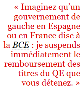 Imaginez qu’un gouvernement de gauche en Espagne ou en France dise à la BCE : je suspends immédiatement le remboursement des titres du QE que vous détenez.