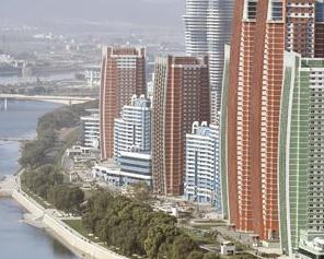 – A la rubrique loisir, Pyongyang c’est aussi, un delphinarium, un cirque aux numéros les plus prisés au monde, un magnifique centre aquatique très fréquenté par des habitants aussi enjoués que mauvais nageurs. Plusieurs fois dans la semaine, des flots de jeunes femmes dans des tailleurs seyants (sans doute surannés pour nos modistes), instrument de musique à l’épaule se retrouvent avant le travail sur une place, à répéter le spectacle collectif vivant, qu’à l’occasion d’une fête, elles proposeront. Coincé entre plusieurs immeubles, il est loisible de pratiquer en toute tranquillité et sécurité, dans des parcs de toutes tailles, le volley-ball, les échecs, les cartes à jouer, le bavardage et de confier les enfants à des jeux d’explorations physiques.