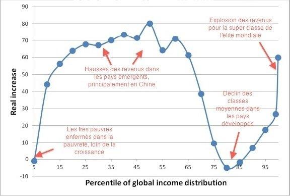Ce genre d’études académiques, démontrant la concentration croissante des revenus et des patrimoines, et leur lien avec la hausse des inégalités dans les pays, se multiplie. Le graphe de l’éléphant de Branko Milanovic, que Marianne a contribué à populariser en France en le publiant dès 2014, est devenu le symbole de cette inégalité, sous-produit de la mondialisation libérale qui ronge les sociétés occidentales :