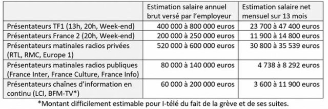 Le Dauphiné libéré a également publié une enquête en avril 2018 sur les salaires des journalistes. Le quotidien régional évoque notamment des ordres de grandeur pour les salaires des présentateurs de TF1 (Gilles Bouleau, Anne-Claire Coudray et Jean-Pierre Pernaut), estimés entre 30.000 et 45.000 euros par mois [3] ; de Ruth Elkrief sur BFM-TV (10.000 euros par mois) ainsi que pour le service public : 15.000 euros net par mois pour Laurent Delahousse (France 2) et 6.000 euros net par mois pour les présentatrices et présentateurs de France 3. Les matinales radio ne sont pas en reste : le prédécesseur de Patrick Cohen au 7-9 d’Europe 1, Thomas Sotto, touchait un salaire de 37.938 euros net par mois selon le Canard enchaîné. Des ordres de grandeur qui demeurent inférieurs au salaire de Claire Chazal, présentatrice de TF1 sur le départ, révélé par Challenges en 2015 : près de 120.000 euros brut par mois.