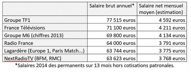 Une enquête de BFM-Business évoquait déjà les salaires des journalistes en CDI au sein des groupes audiovisuels français pour l’année 2014 :