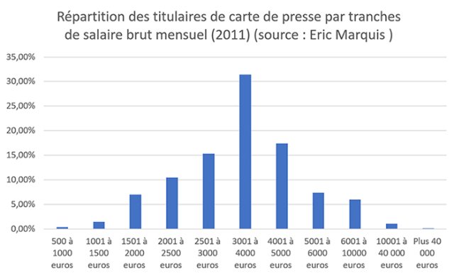 Enfin Le Parisien apporte également d’autres éléments, en évoquant la grille de salaires établie par le Syndicat national des journalistes (SNJ) [1]. En 2017, dans la presse quotidienne nationale, les salaires varient entre 2.162 euros brut à la sortie d’une école de journaliste (près de 1.600€ net) à 5.430 pour un rédacteur en chef (près de 4.200€ net). Pour la presse quotidienne régionale, les salaires sont légèrement inférieurs, de 1.833 à 5.138 euros brut.