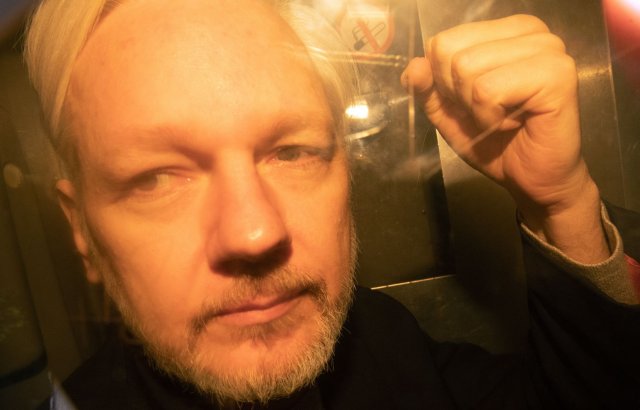 Il pleut, il fait noir, mais comme on sait qu’il est juste derrière la porte métallique il faut crier fort car il peut entendre. On crie, des militantes chantent. L’ambiance est forte et solidaire. Il y a un camion de police et 6 ou 7 flics devant la porte. Ils n’ont pas l’air agressifs et nous disent que c’est pour nous empêcher d’entrer dans le bâtiment. Ils savent qu’on ne va pas le faire, tout le monde est bien trop obéissant ici. Notre attente dure encore une heure. Ils attendent que le trafic du vendredi soir passe pour que le fourgon ne soit pas coincé dans les embouteillages ? Ils veulent le faire passer par l’autre porte de derrière ? On ne sait pas. Puis lentement la porte se soulève. D’abord deux fourgons entrent vides, puis sortent, un petit et un grand tous deux SERCO. On se rue dessus, exténués et en rage. Surtout sur le deuxième dont tout le monde dit que Julian est dedans. On est dix à tambouriner sur le blindage en hurlant « we are with you », « free Julian » de toutes nos forces. Les photographes flashent l’intérieur. Une militante, Cynthia nous dira que Julian Assange était assis du coté ou elle se tenait et qu’elle a pu le voir quand le photographe a flashé et éclairé l’intérieur.