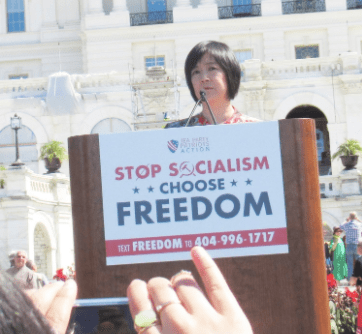 « Je ne veux plus vivre dans une quelconque sorte de socialisme » a déclaré Zeng devant la foule. « Mais ici, aux États-Unis, je commence à avoir l’impression qu’il m’a suivi ».