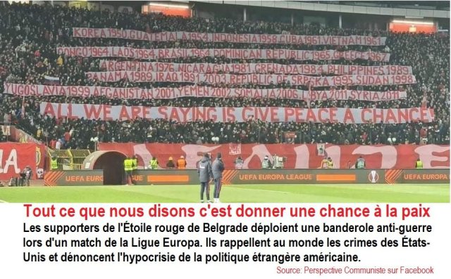 Le bon sens populaire s’exprime dans un stade de Serbie, pays qui n’a pas oublié les bombardements de l’OTAN en 1999 pour imposer l’indépendance du Kosovo... en rappelant la longue liste des guerres de l’OTAN