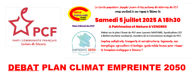 Je remercie l’association Patrimoine et Nature de nous accueillir sur leur site et la section Sud-Biterrois pour la qualité de leur organisation et bien sur Laurent SANTOIRE, ingénieur, militant du PCF et de la CGT et co-auteur du Plan Climat.